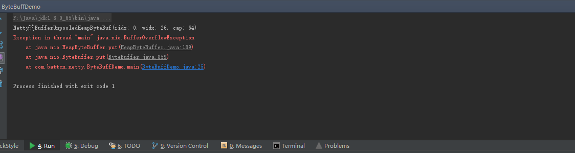 JDK自带的ByteBuffer无法做到自动扩容,当内容超出的时候会抛出索引越界的异常,接下来看一段代码