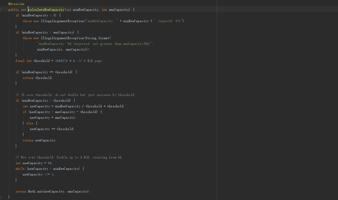 - 最后就是扩容处理了,Netty的做法是默认64字节,小于阀值取64,大于取64 `<<= 1,成倍递增