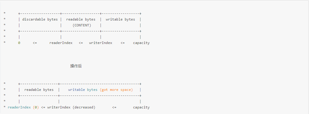 从日志输出中可以看到,使用JDK自带的特别的麻烦,远远没有ByteBuf来的方便,无需关心读写切换指针的问题,在JDK中,由于只有一个一个position指针,我们需要通过flip()进行转换控制,而Netty却可以很好的帮我们做到扩容,它的内部维护了readerIndex与writerIndex两个指针,一开始都是0,随着数据的写入writerIndex会增加但不会超过readerIndex,当我们读取后内部会通过调用discardReadBytes来释放这部分空间,类似ByteBuffer的compact方法,readerIndex与writerIndex都是可读取的,等同ByteBuffer中position -> limit之间的数据,WriterIndex和capacity之间空间是可写的,等同ByteBuffer中limit -> capacity